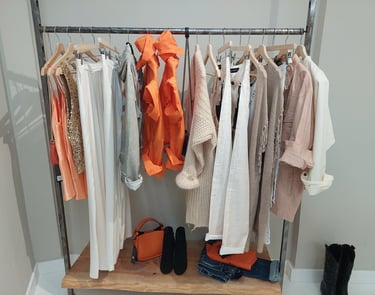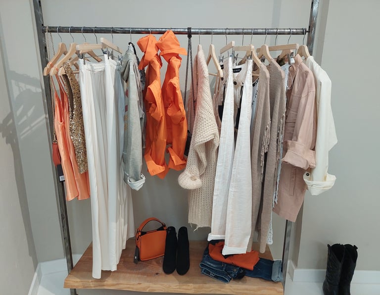 The boutique features clothing options which include formal wear, casual wear, evening gowns, and separates, focusing on timeless and sophisticated styles.